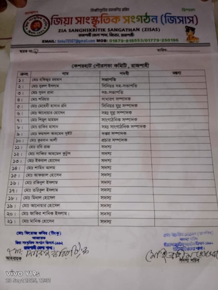 রাজশাহী জেলার মোহনপুর উপজেলায় কেশর হাট উপজেলার কেশর হাট বাংলাদেশ সাংস্কৃতিক সংগঠনের এর কমিটি অনুমোদন
